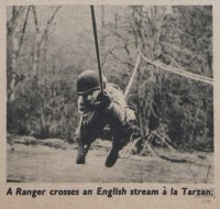 The Rangers' day begins at 7.00 with Reveille by bagpipe. "We hate'm worse than bugles." Breakfast at 8. Drill begins at 9, with 40-minute periods until 12.45 when they knock off for lunch at one. There are 5-minute breaks between periods, but since the next period may be a mile away, they spend the "break" running to get there on time. At 2 the periods begin again until 5 when there is "tea," which consists of a very light supper. After chow, they have to clean their equipment, always soaked in water and caked with mud, until lights out at 9.30. Every couple of nights there are night problems, lasting from a couple of hours to all night.