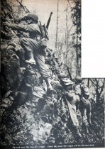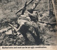 They might have a go at one of the assault courses which are built up the mountain sides. Starting from the protection of a gravel pit beside the road, they crawl through barbed wire, over a fence, into a "house" made of old bits of rusty corrugated tin, then past bayonet dummies, down into a gully, slimy with mud. They advance in pairs, each man protecting his partner. One tow-headed fellow steps on a land mine. It explodes right in his face. He falls face down into the mud. Instantly the instructor leaps through the mud and is beside him to see if he is hurt. But he picks himself up, black except a little lock of yellow hair. He looks for his pal and the two start forward again. Over a "fence" about twenty feet high. They climb part way down and then jump into a mud hole up to their arm pits. It's all they can do to struggle out of it. Then they advance from hummock to hummock, throwing themselves into the mud and firing live ammunition over the heads of the men in front, aiming at the objective they are assigned to capture.