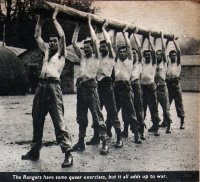 The afternoon periods might be thrown into one for a speed march. Twelve miles or fifteen miles, with combat equipment and rifles. The Rangers have broken all speed march records. Fifteen miles in 2 hours and 30 minutes. Twelve miles in 1 hour and 46 minutes, against the old record of one hour and fifty-eight minutes. They doubleÂtime for a while then march fast-time for a while. Behind them comes a sandy-haired captain of the Commandos, who looks as if butter wouldn't melt in his mouth. If the men get tired and start to get out of file, he just sends a few rounds from his tommy gun up between the files. And the butter still doesn't melt in his mouth. If he is not along there is a sergeant who takes his place and he's an even better shot.