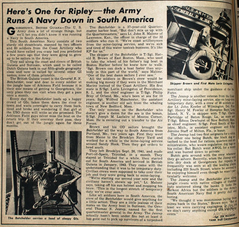 Like all soldiers here in South America, the crew of the Batchelder would give anything for a little action. They are a little jealous of their mates on the Army boat in Surinam, the General Thomas N. Jessup, named for the first quartermaster general in the Army. The Jessup actually hasn't been under fire but at least it has gone out to pick up survivors of a torpedoed merchant ship under the guidance of the Air Force.