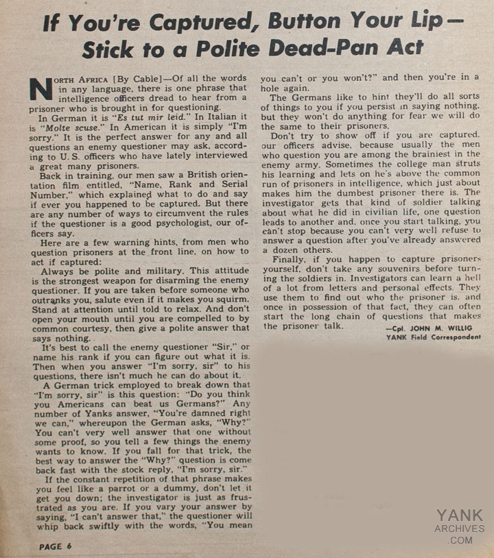 Don't try to show off if you are captured, our officers advise, because usually the men who question you are among the brainiest in the enemy army. Sometimes the college man struts his learning and lets on he's above the common run of prisoners in intelligence, which just about makes him the dumbest prisoner there is. The investigator gets that kind of soldier talking about what he did in civilian life, one question leads to another and, once you start talking, you can't stop because you can't very well refuse to answer a question after you've already answered a dozen others.
