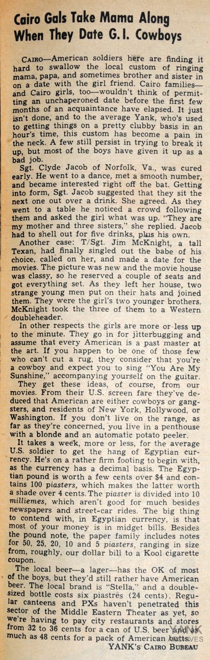 CAIRO — American soldiers here are finding it hard to swallow the local custom of bringing mama, papa, and sometimes brother and sister in on a date with the girl friend. Cairo families — and Cairo girls, too — wouldn't think of permitting an unchaperoned date before the first few months of an acquaintance have elapsed. It just isn't done, and to the average Yank, who's used to getting things on a pretty clubby basis in an hour's time, this custom has become a pain in the neck. A few still persist in trying to break it up, but most of the boys have given it up as a bad job.