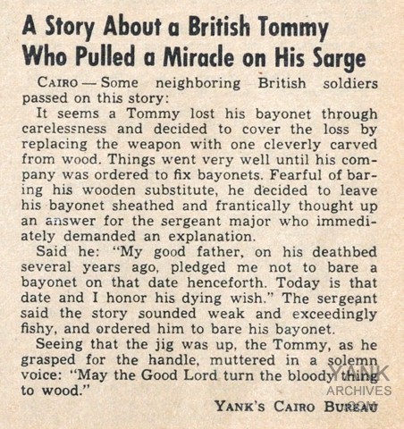 CAIRO — Some neighboring British soldiers passed on this story:It seems a Tommy lost his bayonet through carelessness and decided to cover the loss by replacing the weapon with one cleverly carved from wood. Things went very well until his company was ordered to fix bayonets. Fearful of baring his wooden substitute, he decided to leave his bayonet sheathed and frantically thought up an answer for the sergeant major who immediately demanded an explanation.