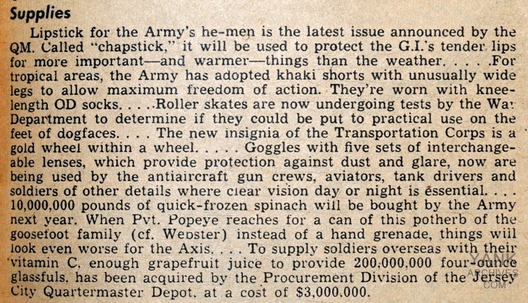 Lipstick for the Army's he-men is the latest issue announced by the QM. Called "chapstick," it will be used to protect the G.I.'s tender lips for more important — and warmer — things than the weather.... For tropical areas, the Army has adopted khaki-shorts with unusually wide legs to allow maximum freedom of action. They're worn with kneelength OD socks.... Roller skates are now undergoing tests by the War Department to determine if they could be put to practical use on the feet of dogfaces.... 10,000,600 pounds of quick-frozen spinach will be bought by the Army next year. When Pvt. Popeye reaches for a can of this potherb of the goosefoot family (cf, Webster) instead of a hand grenade, things will look even worse for the Axis.A photo of the newsbite can be found here