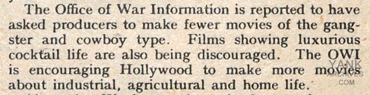 The Office of War Information is reported to have asked producers to make fewer movies of the gangster and cowboy type. Films showing luxurious cocktail life are also being discouraged. The OWI is encouraging Hollywood to make more movies about industrial, agricultural and home life.